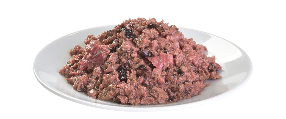 Composition: viande et sous-produits d'origine animale dans les bouchées 85 % (agneau 8 %), jus de viande 9,6 %, plantes et fruits 1,5 % (clou de girofle, agrumes, romarin, curcuma), myrtilles 0,5 %, minéraux 1 %, huile de saumon 1 %, mannane-oligosaccharides 0,5 %, fructo-oligosaccharides 0,5 %, inuline 0,4 %.