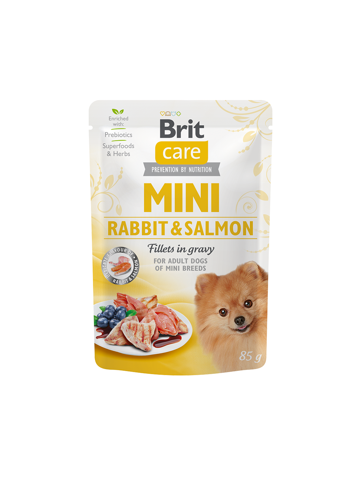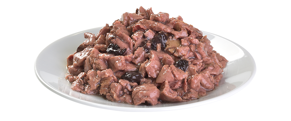 Composition: viande et sous-produits d'origine animale dans les bouchées 45 % (lapin 4 %), poissons et sous-produits de poisson dans les bouchées 35 % (saumon 4 %), jus de viande 9,6 %, plantes et fruits 1,5 % (clou de girofle, agrumes, romarin, curcuma), myrtilles 0,5 %, minéraux 1 %, huile de saumon 1 %, mannane-oligosaccharides 0,5 %, fructo-oligosaccharides 0,5 %, inuline 0,4 %.