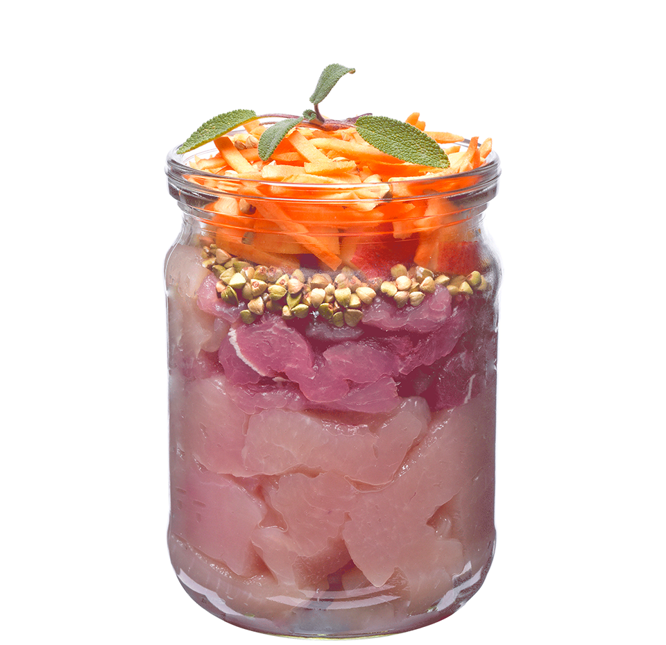 Composition: poulet 48 %, dinde 28 %, bouillon 11 %, patates douces 4,5 %, pommes 2 %, minéraux 2 %, sarrasin 1,3 %, mélange de plantes (romarin, thym, souci, pissenlit) 1 %, huile de saumon 1 %, persil 0,5 %, graines de lin 0,5 %, algues et cassis 0,2 %.