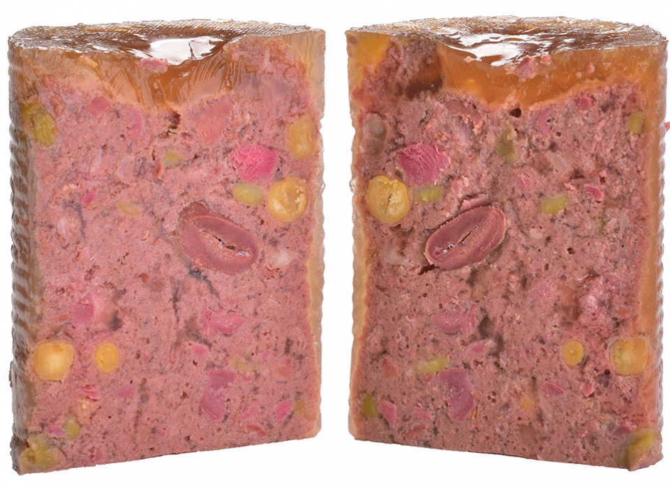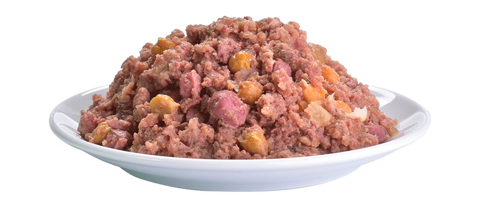 Composition: dinde 68 %, bouillon 13 %, sarrasin 4,3 %, pois 4 %, pois chiche 3 %, pommes 2 %, minéraux 2 %, mélange d'herbes (romarin, thym, souci, pissenlit) 1 %, persil 1 %, huile de saumon 1 %, graines de lin 0,5 %, algues et aronia 0,2 %.