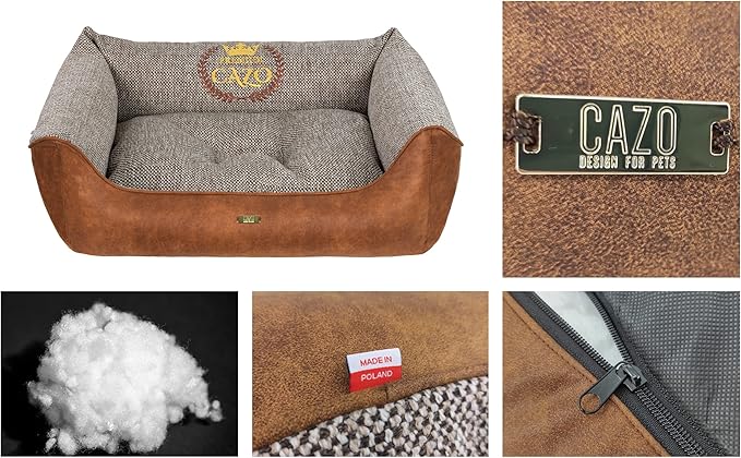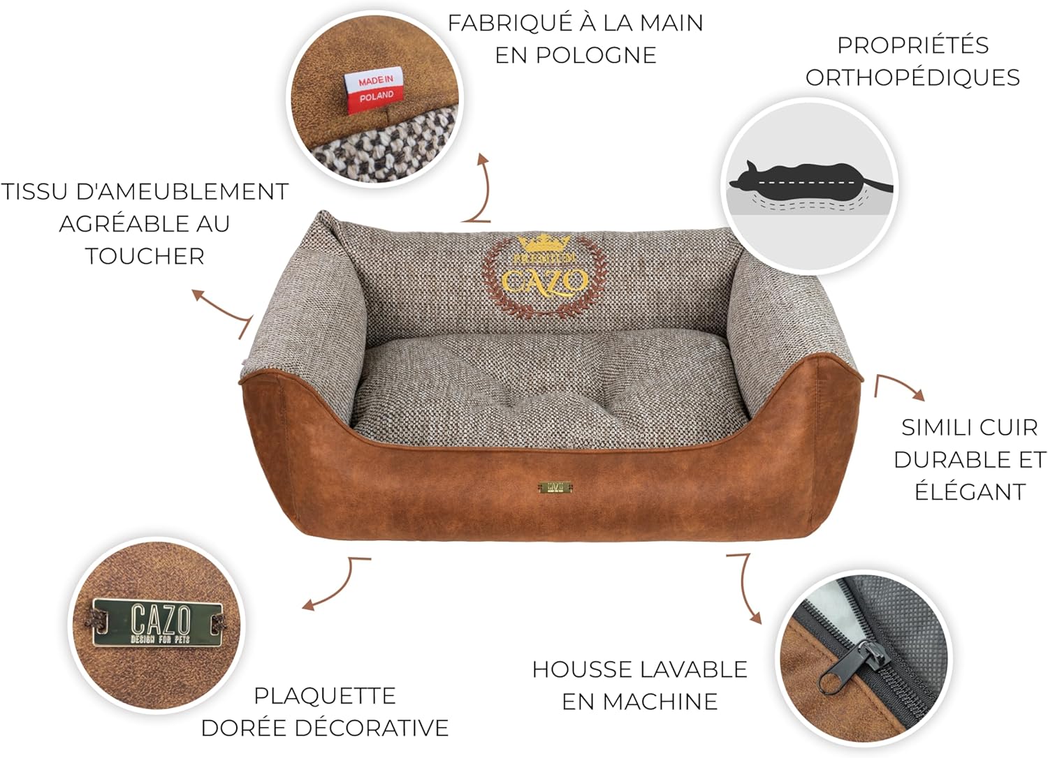 Lit exclusif pour chien ou chat de la marque Cazo. Extérieur en simili-cuir de haute qualité combiné à un tissu exceptionnellement doux. Le lit est équipé d'une housse amovible, lavable à 30 degrés.