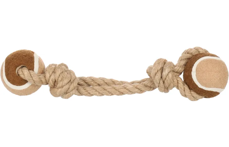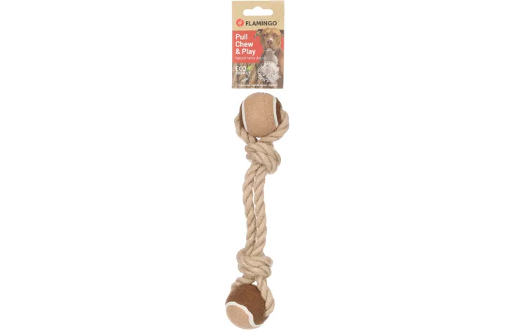 Ce jouet est parfait pour ton chien ! Fabriqué en chanvre naturel, avec 2 nœuds et une balle. Idéal pour mâcher et jouer.