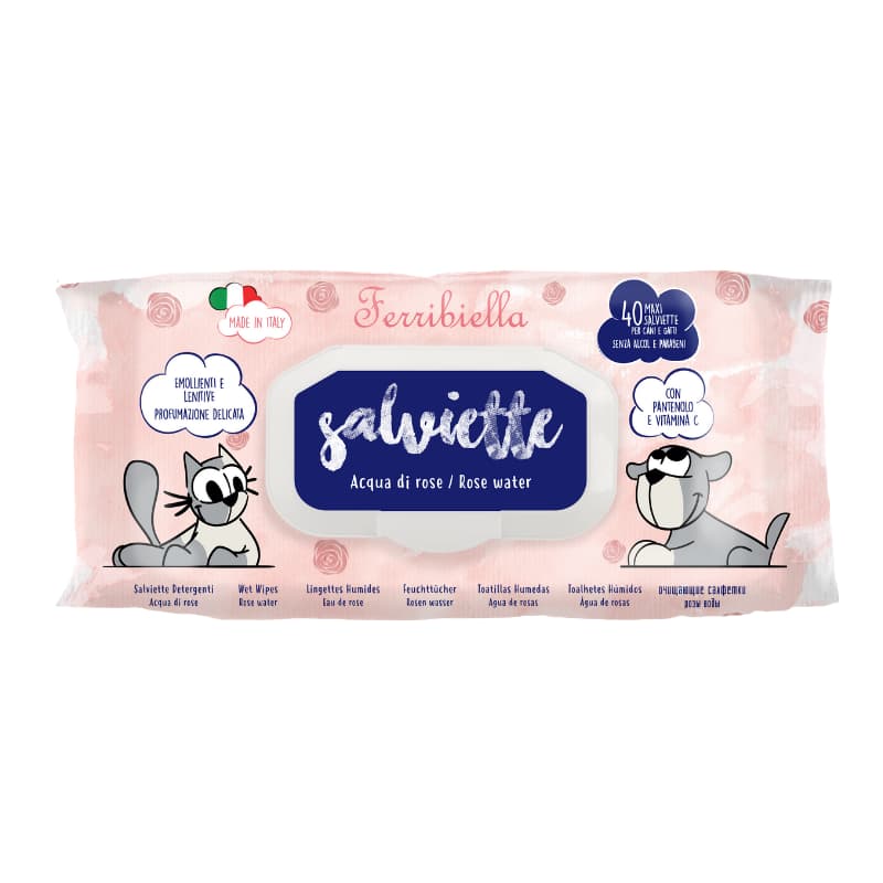 Ferribiella brand wipes for dogs and cats with rose water. Contains soothing ingredients, vitamin E and panthenol (Vitamin B). Acts deeply and neutralizes bad odors.