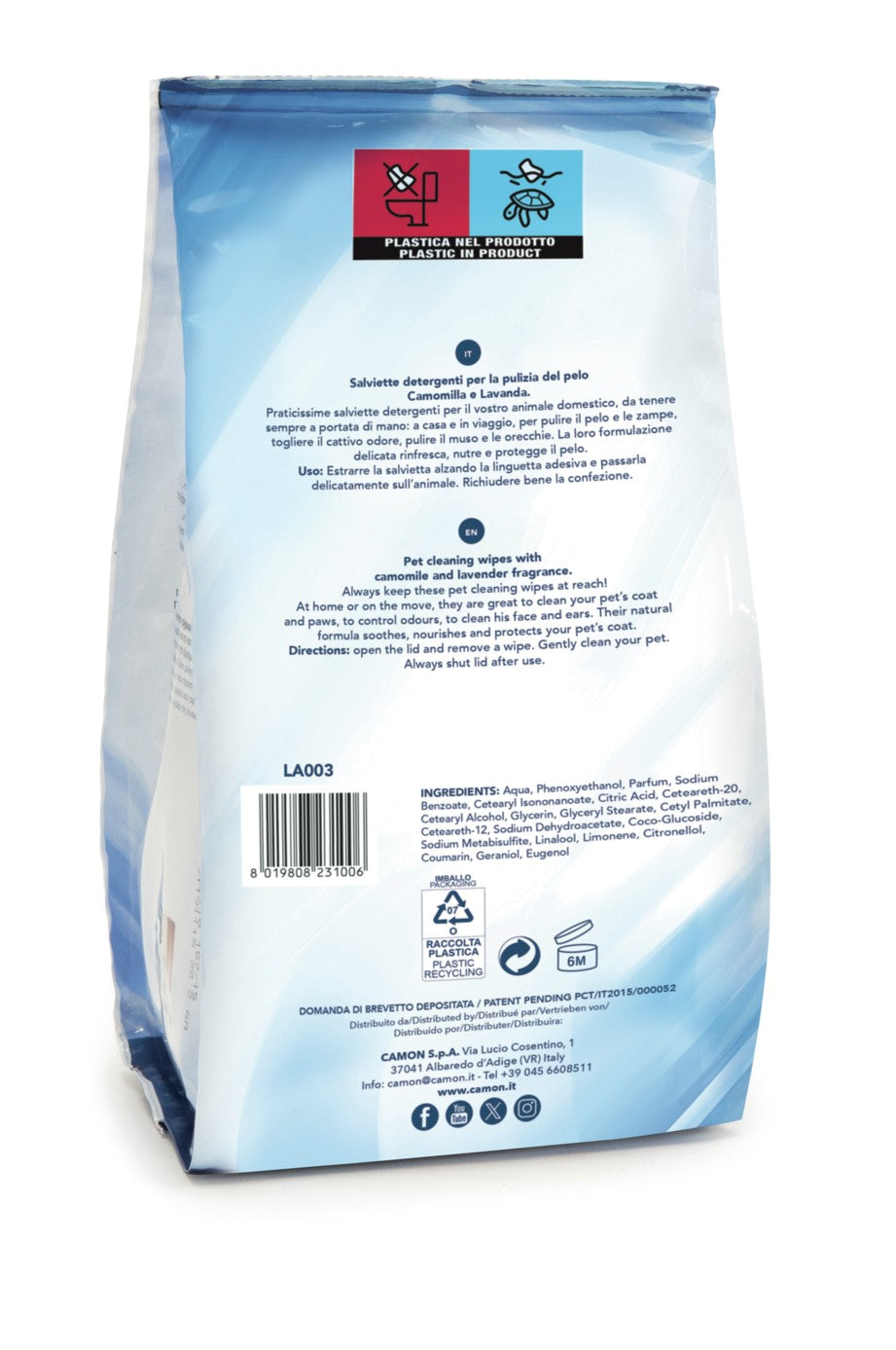 Lingettes nettoyantes pour nettoyer le pelage et le museau, au parfum de camomille et de lavande, au format maxi de 100 pièces.