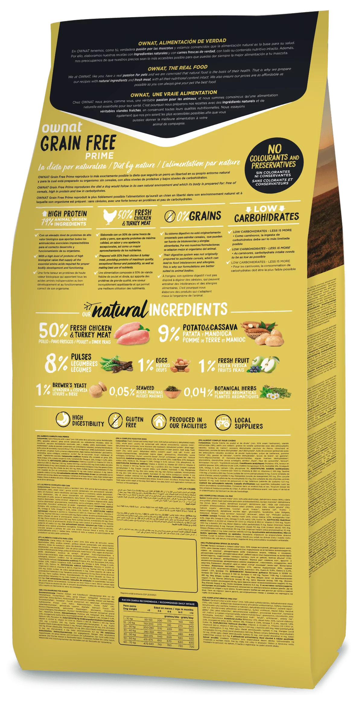 Fresh chicken and turkey meat* (min. 50% before extrusion), dehydrated meat (18%), whole peas*, poultry fat (preserved with natural antioxidants), cassava roots*, dehydrated fish ( Peruvian anchovies, horse mackerel and mackerel), dehydrated potato*, dehydrated egg*, fish oil (preserved with natural antioxidants), hydrolyzed chicken protein, beet pulp, fresh apple* (1%), carob pod *, dehydrated alfalfa*, brewer's yeast*, rock salt*, fructo-oligosaccharides and mannan-oligosaccharides, dehydrated seaweed*, glucosamine, chondroitin, yucca schidigera, cranberries*, thyme*, chamomile flower*, fennel*, echinacea *, green tea*. *Natural ingredients