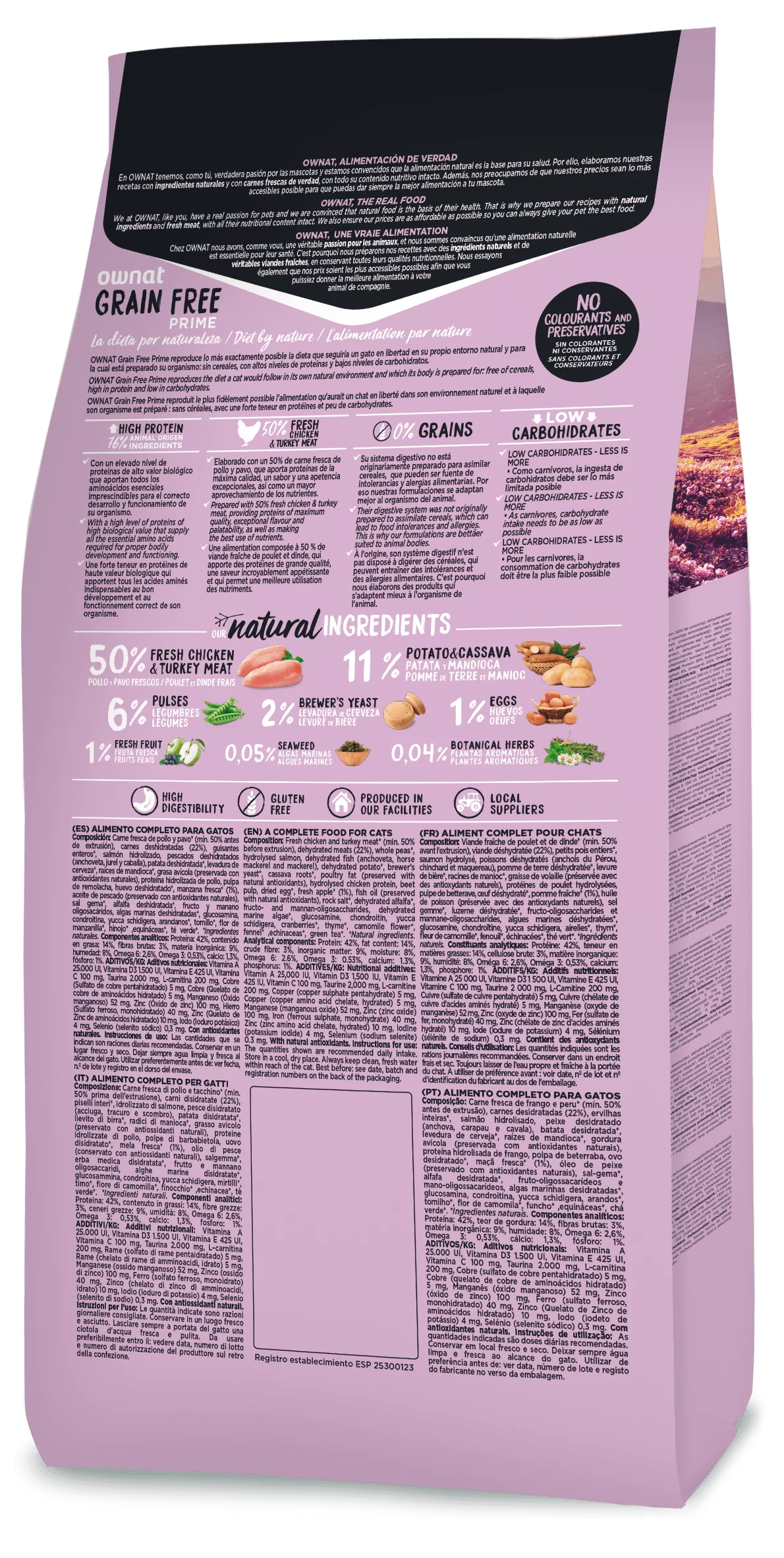 Fresh chicken and turkey meat* (min. 50% before extrusion), dehydrated meat (20%), cassava roots*, whole peas*, hydrolyzed salmon, dehydrated potato*, dehydrated fish (anchovies from Peru, horse mackerel and mackerel), brewer's yeast*, beet pulp, poultry fat (preserved with natural antioxidants), hydrolyzed chicken protein, dehydrated egg*, fresh apple* (1%), fish oil (preserved with natural antioxidants), rock salt*, dehydrated alfalfa*, fructo-oligosaccharides and mannan-oligosaccharides, dehydrated marine algae*, glucosamine, chondroitin, yucca schidigera, cranberries*, thyme*, chamomile flower*, fennel*, echinacea*, green tea*. *Natural ingredients