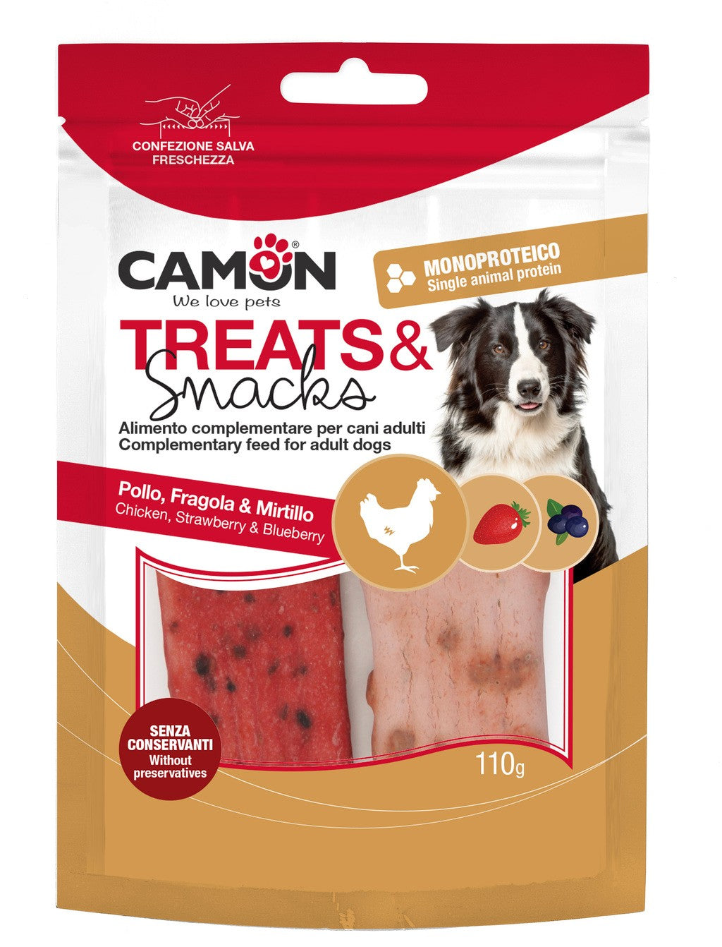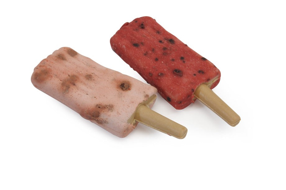 De délicieuses collations pour chiens sous forme de sucettes glacées au poulet aux saveurs de fraise et de myrtille.