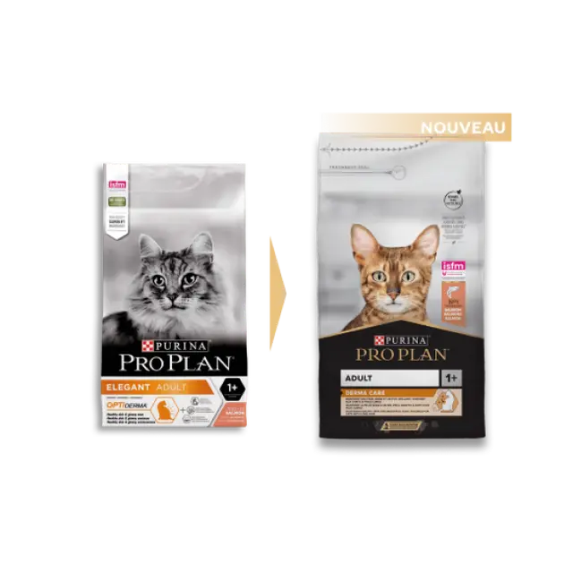 Also suitable for hairball control. PURINA® PRO PLAN® ELEGANT is scientifically formulated for long-haired cats with sensitive skin or coat. It contains OPTIDerma®, a patented* solution, proven to maintain healthy skin and a silky coat.