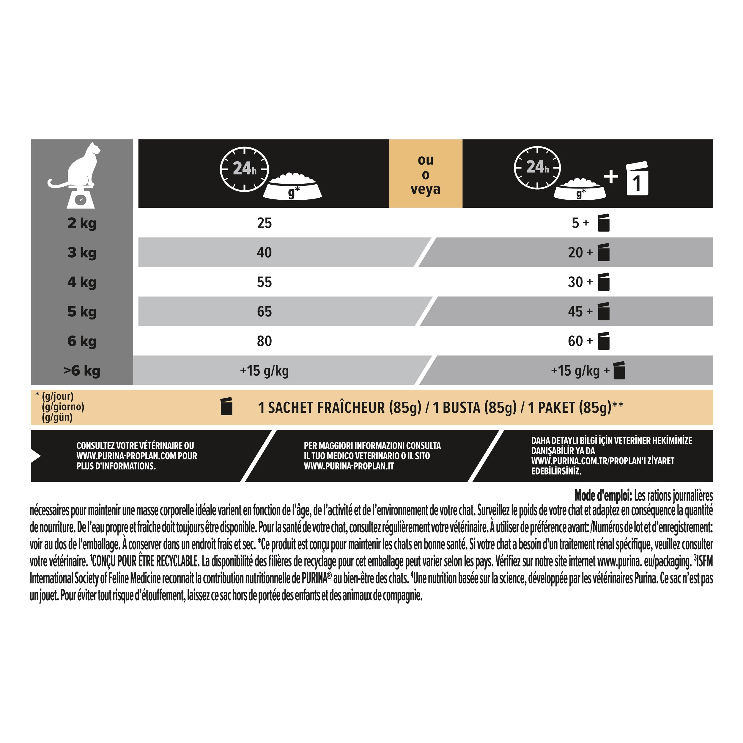 The daily rations needed to maintain an ideal body mass vary depending on your cat's age, activity and environment. Monitor your cat's weight and adjust the amount of food accordingly. Clean, fresh water should always be available. For the health of your cat, consult your veterinarian regularly.