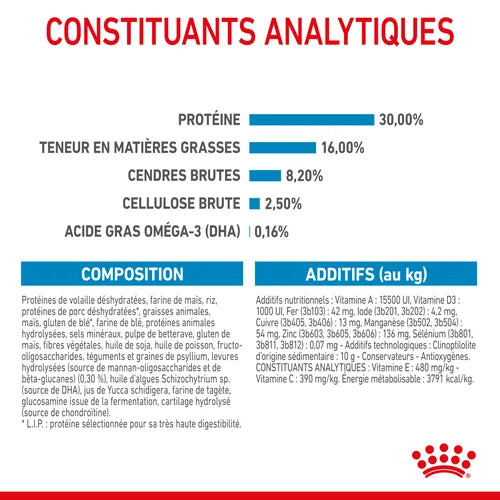 Analytical constituents: Protein: 30% - Fat content: 16% - Crude ash: 7.7% - Crude fiber: 2.6%.