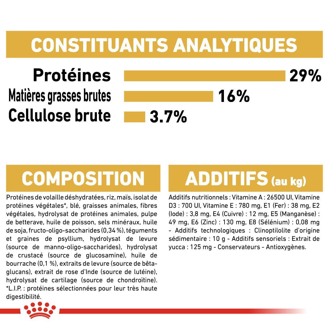 Analytical constituents: Proteins: 29.0% - Fat content: 16.0% - Crude ash: 7.4% - Crude fiber: 3.7%.