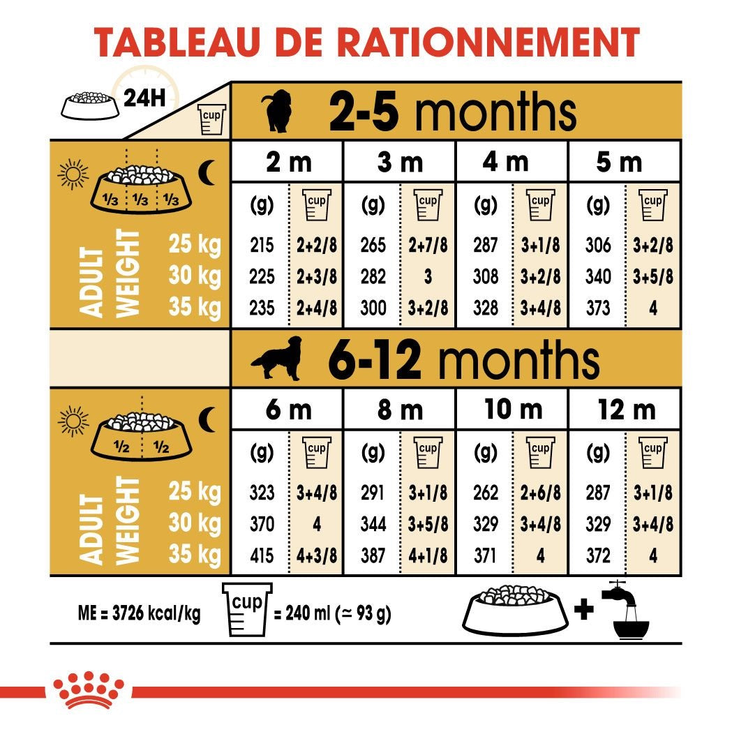 ROYAL CANIN® Golden Retriever Puppy is specially designed to meet all the nutritional needs of your young Golden Retriever, and is suitable for puppies under 15 months of age. During this key phase of growth, your puppy's immune system is gradually developing: this is why ROYAL CANIN® Golden Retriever Puppy contains an antioxidant complex to strengthen your puppy's natural defenses to help him to stay healthy while growing. Thanks to its exclusive formula, ROYAL CANIN® Golden Retriever Puppy preserves the health of your young dog's skin and coat. Enriched with EPA and DHA omega-3 fatty acids and borage oil, this formula helps to strengthen the skin's “barrier” role. To support your dog's good digestive health, ROYAL CANIN® Golden Retriever Puppy contains a blend of specific nutrients including high-quality proteins and prebiotics. These nutrients act to maintain the proper balance of intestinal flora, which contributes to good stool quality.