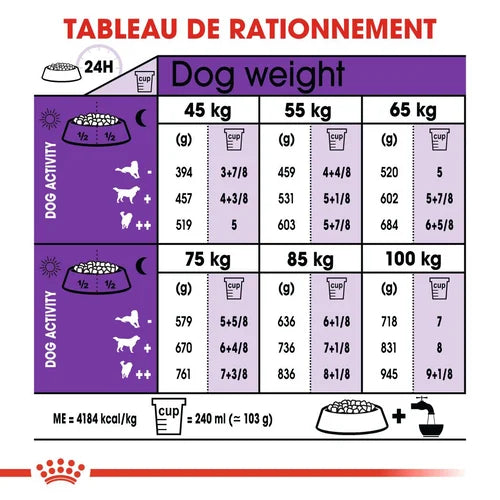 | Dog weight | Indoor life - no exercise | Normal activity | Very active dogs |