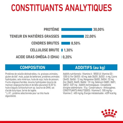ROYAL CANIN® Mini Starter Mother & Babydog kibbles are specially formulated to meet the nutritional needs of the female dog and her puppies. This formula is suitable for adult dogs of small breeds weighing up to 10 kg, and for weaning puppies up to 2 months old. This formula is therefore specially adapted to meet in a single food the high energy needs of your small breed female dog at the end of gestation and during lactation. It is also designed to promote the good development of nursing and weaning puppies. ROYAL CANIN® Mini Starter Mother & Babydog dry food contains nutrients such as vitamins C and E to help puppies support the healthy development of their still immature immune systems. Thanks to a combination of beneficial prebiotic fibers (such as MOS) and highly digestible proteins, ROYAL CANIN® Mini Starter Mother & Babydog supports the development of your puppy's intestinal microbiota and promotes its balance, to ensure good digestive health. In addition, this formula is enriched with omega-3 fatty acids (including DHA), scientifically proven to contribute to the good brain development and visual health of puppies. ROYAL CANIN® Mini Starter Mother & Babydog kibbles are easy to rehydrate with lukewarm water, which softens them and better releases their aromas, in order to stimulate the appetite of puppies when weaning and promote their hydration. At 2 months of age, your puppies will need a specially adapted diet to meet the nutritional needs of their next phase of growth. At this point, you can begin the transition to ROYAL CANIN® Mini Puppy food, available as kibble or wet food in sauce. All dry foods in our growth range contain antioxidants of natural origin, and are formulated without artificial colors or flavors.