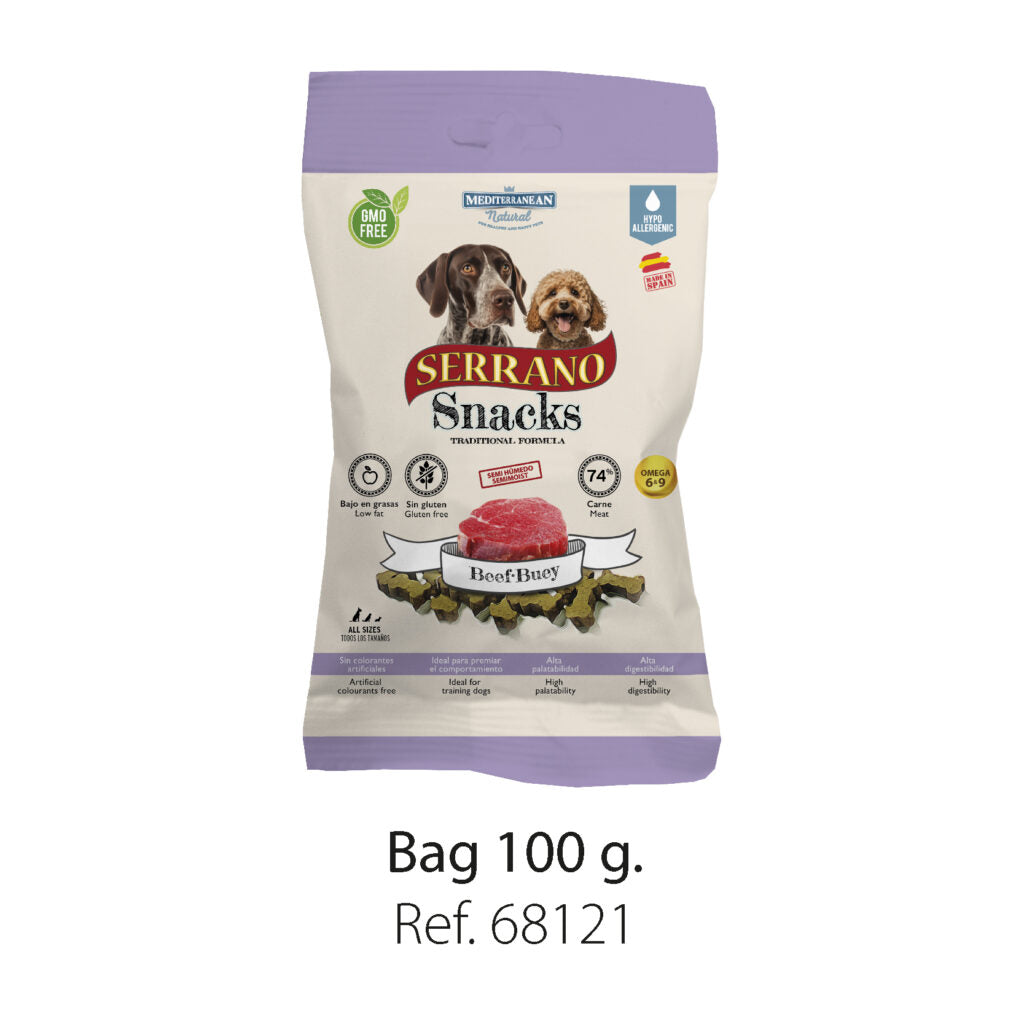 Les Serrano Snacks, délicatement coupés en petits morceaux en forme d’os, garantissent la sécurité de votre animal, tout en conservant tous ses nutriments, reflétant une alimentation naturelle et contenant près de 70 % de viande (69 % dans les « Serrano Snacks pour chiots »).