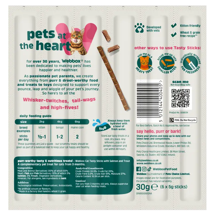 Fresh drinking water should be provided at all times. The quantities stated above should be used as a guide only. Please adjust the quantity given to keep your cat in a slim and active state. Attention : For cats from 3 months only. Always supervise your cat when giving treats. If necessary, divide it into smaller pieces for smaller cats and kittens.