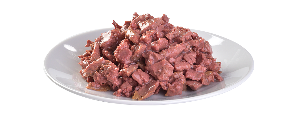 Composition: 85 % viande dans les filets (62 % poulet, 15 % foie, 8 % saumon), bouillon, 1 % argousier, 0,5 % capucine, minéraux, amidon de pois.