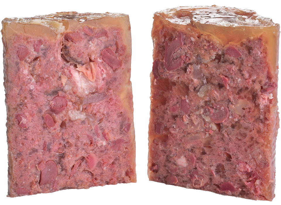 Pur pâté avec des morceaux entiers d’organes et de viande. Aliment complet pour chiens.