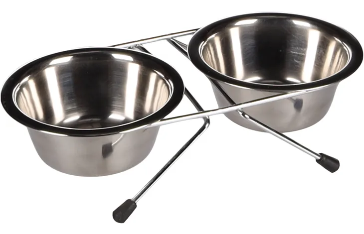 Ensemble repas pour chiens avec 2 bols en inox dans un support pratique. Antidérapant et compatible lave-vaisselle. Manger et boire n'a jamais été aussi facile et élégant !