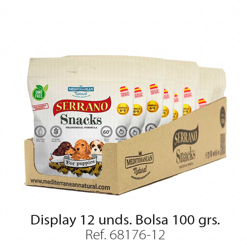 MEDITERRANEAN NATURAL Serrano Snacks, délicatement coupés en petites quantités en forme d'os, garantissent la sécurité de l'animal, maintiennent sa pureté et tous les nutriments, reflètent l'alimentation naturelle et contiennent 70% de viande (60% dans "Serrano Snacks pour chiots) »).
