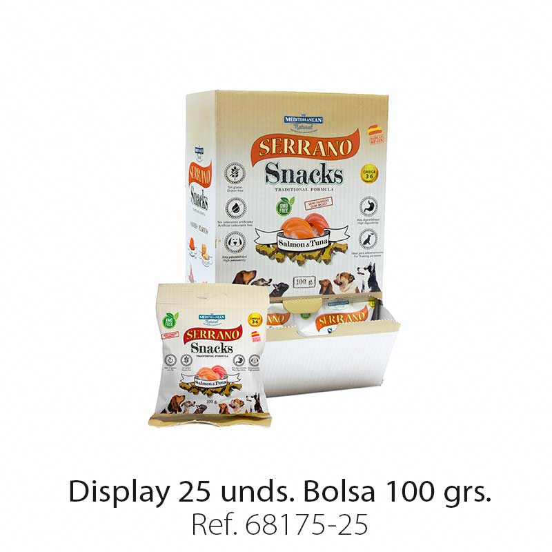 Fabriqués avec des matières premières sans gluten, ils ne contiennent pas de colorants artificiels, d'acides gras transgéniques ou trans. C'est un produit hypoallergénique (sauf pour les saveurs "saumon et thon" et "pour chiots") une source naturelle d'acide oléique. Les Snacks Serrano au saumon et au thon apportent des Oméga 3 et 6.