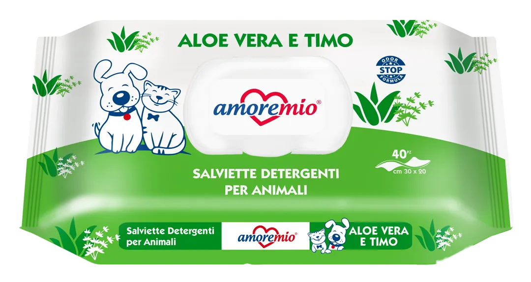 Les lingettes nettoyantes humides douces d’AmoreMio sont idéales pour le nettoyage quotidien de nos amis à quatre pattes. Ils conviennent pour un nettoyage rapide et en douceur du pelage, des pattes, de la peau sans provoquer d’irritation ou de rougeur donnant une sensation de fraîcheur. Convient aux chiens et aux chats. Avec un parfum d'Aloe Vera et Thym.