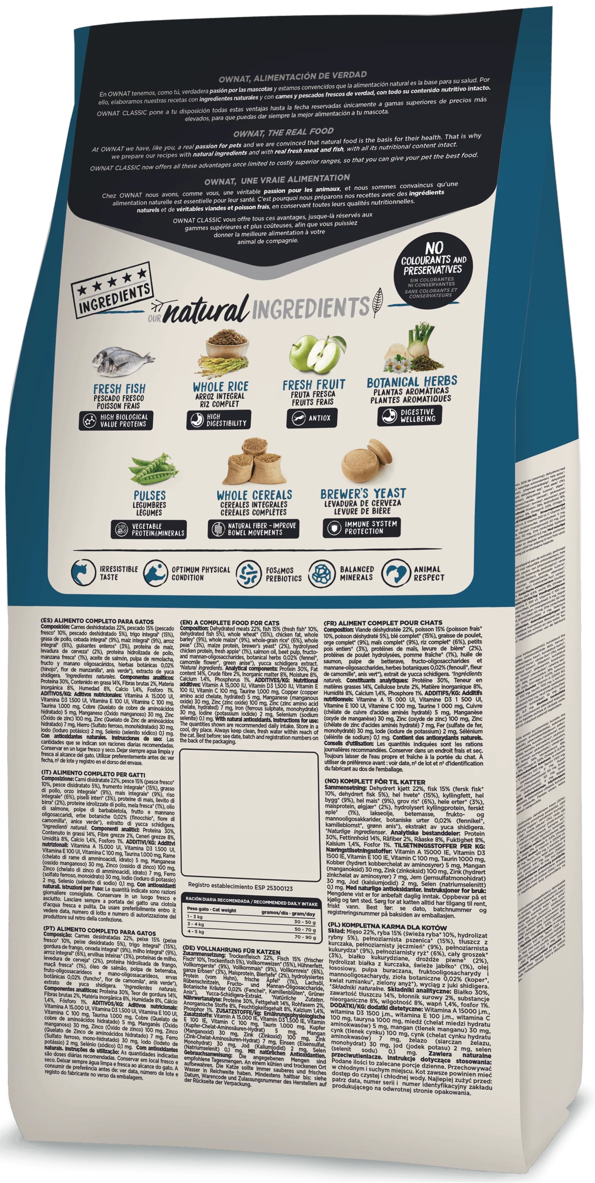 Les quantités indiquées sont les rations journalières recommandées. Conserver dans un endroit frais et sec. Toujours laisser de l’eau propre et fraîche à la portée du chat. Expiration: 18 mois.