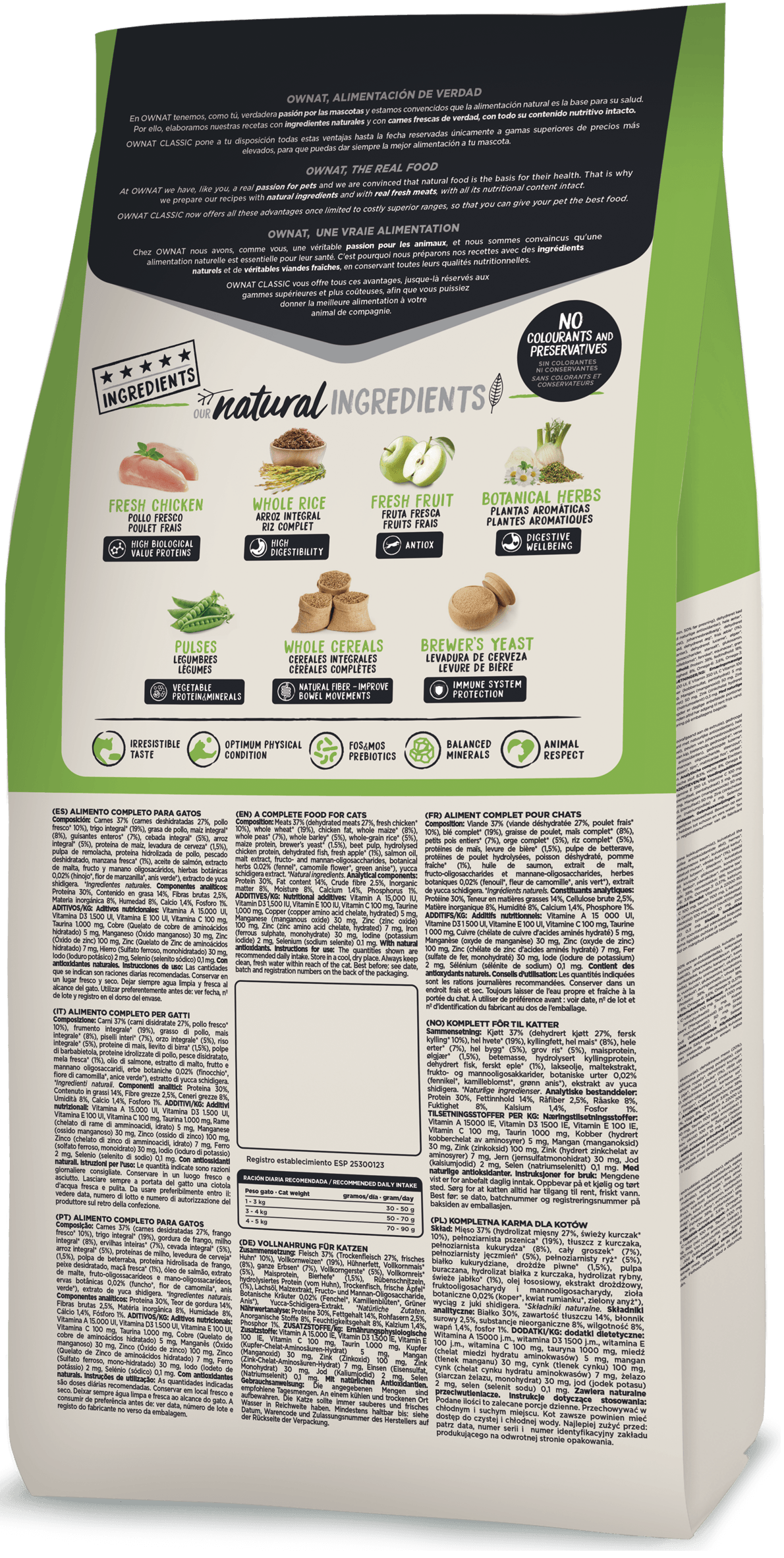 Les quantités indiquées sont les rations journalières recommandées. Conserver dans un endroit frais et sec. Toujours laisser de l’eau propre et fraîche à la portée du chat. Expiration: 18 mois.
