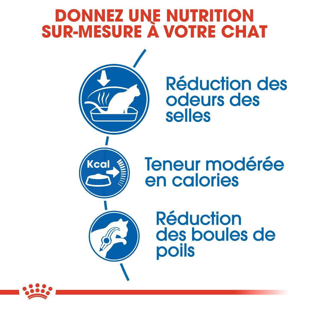 Les chats d’intérieur adultes comme le vôtre ont tendance à faire moins d’exercice que les chats d’extérieur, c’est pourquoi il est important qu’ils reçoivent une alimentation équilibrée et complète contenant des nutriments bénéfiques favorisant une santé optimale. ROYAL CANIN® Indoor 27 contient des protéines hautement digestibles (L.I.P.) spécifiquement sélectionnées pour leur très haute digestibilité. Elles contribuent également à réduire la quantité des selles de votre chat, ainsi que l’odeur qu’elles peuvent produire lorsque les chats ont un transit intestinal moins efficace en raison du manque d’exercice. La teneur modérée de cet aliment en matières grasses garantit que l’apport calorique de votre chat est adapté à son niveau d’activité, cet apport calorique contribuant également à maintenir son poids de forme. Il est courant que les chats d’intérieur passent de longs moments faire leur toilette. Grâce à l’ajout de fibres alimentaires spécifiques, comme le psyllium, cet aliment favorise également l’élimination des poils ingérés, réduisant ainsi considérablement la formation de boules de poils. La gamme ROYAL CANIN® Indoor est également disponible en fonction du mode de vie, de la morphologie et de l’âge de votre chat : Indoor Long Hair et Indoor 7+. Pour répondre aux préférences individuelles de chaque chat, ROYAL CANIN® Indoor est également disponible sous forme de morceaux en sauce, en gelée ou en mousse. Si vous envisagez une alimentation mixte, il vous suffit de suivre nos instructions pour vous assurer que votre chat reçoit la quantité de nourriture sèche et humide nécessaire pour un bénéfice optimal.