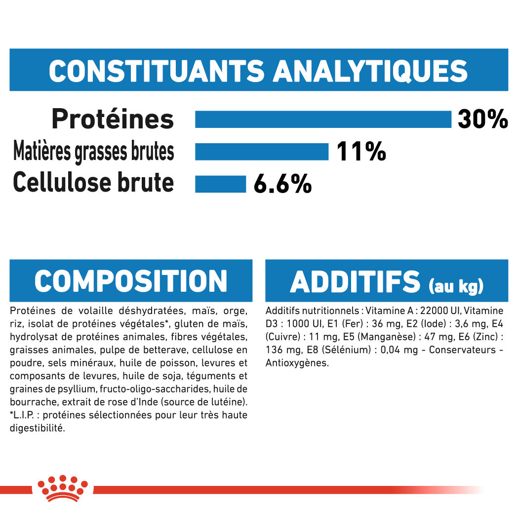 Constituants analytiques : Protéine : 30,0% - Teneur en matières grasses : 11,0% - Cendres brutes : 5% - Cellulose brute : 8,6%.