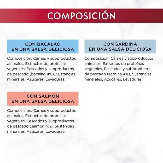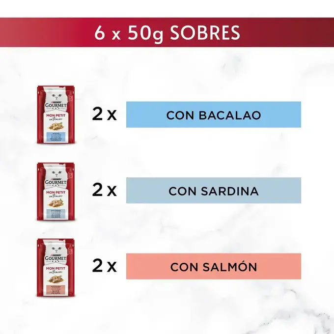 GOURMET Mon Petit est une gamme de recettes GOURMET exquises spécialement développées pour que votre chat puisse savourer une grande variété de saveurs dans la bonne mesure : des découpes fines avec viande ou poisson préparées dans une sauce délicieuse pour un excellent repas. GOURMET Mon Petit est présenté dans un petit sachet de 50g, afin que chaque repas de votre chat puisse être servi frais pour qu’il le mange d’un coup, ce qui signifie plus de plaisir et de variété pour lui, sans vous laisser de restes.