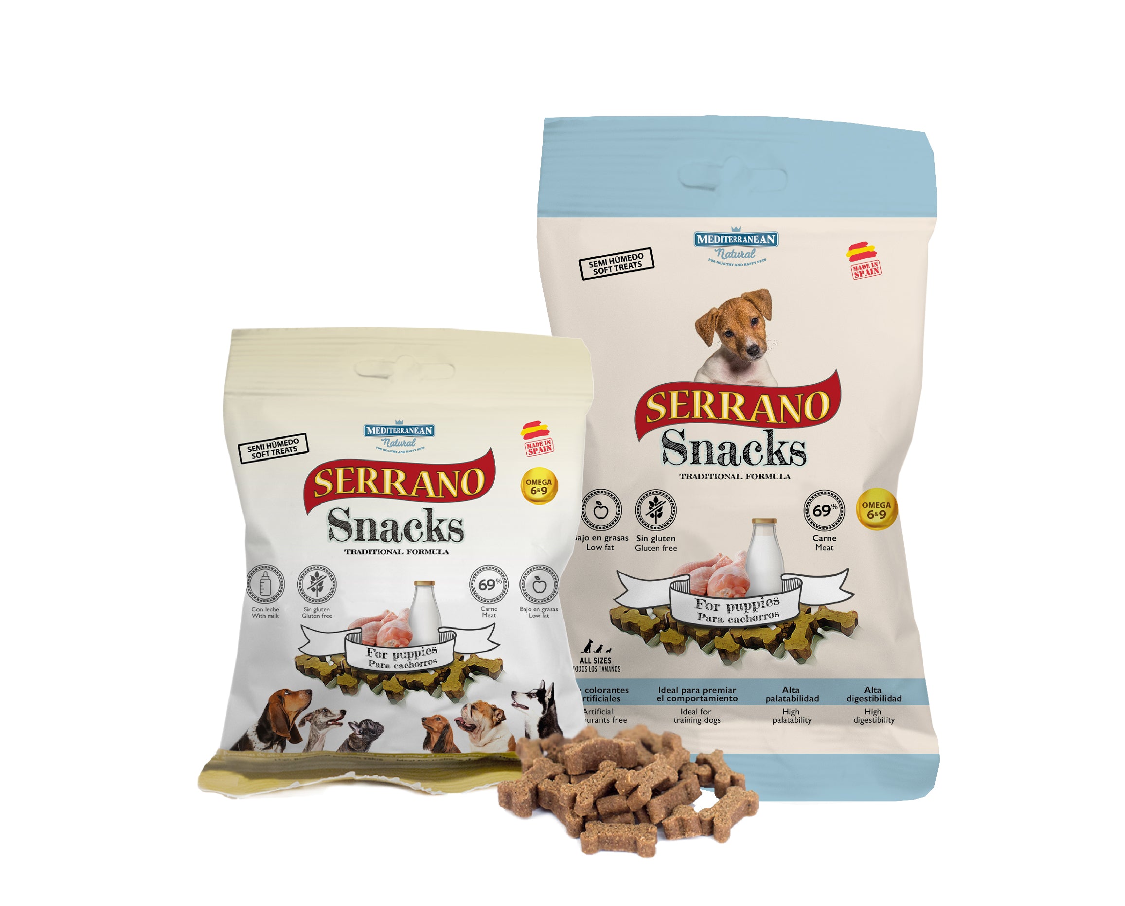Les Serrano Snacks, délicatement coupés en petits morceaux en forme d’os, garantissent la sécurité de votre animal, tout en conservant tous ses nutriments, reflétant une alimentation naturelle et contenant près de 70 % de viande (69 % dans les « Serrano Snacks pour chiots »).
