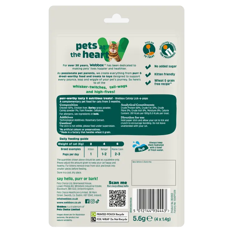 Offrez à votre chat une expérience agréable avec Webbox Lick-e-Pops avec herbe à chat. Fabriquées avec 92 % de poulet, ces friandises sont conçues pour captiver les sens de votre chat et lui offrir une récompense savoureuse. Le design unique de la sucette encourage le jeu interactif, ce qui rend l’heure des friandises à la fois amusante et engageante.
