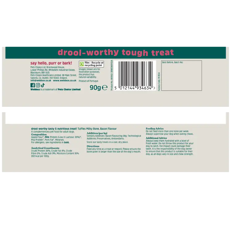 Avec la livraison gratuite au Royaume-Uni pour les commandes de plus de 40 £ et une option de retrait DPD, il est facile et pratique d’acheminer cette friandise à votre porte. Que ce soit pour récompenser un bon comportement, l’entraînement ou simplement donner à votre chien une bouchée savoureuse, le Webbox Tuffies Milky Bone avec bacon est une option délicieuse et digeste.